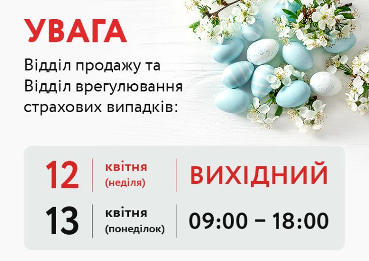 Звертаємо Вашу увагу на графік роботи відділу врегулювання страхових випадків та відділу продажу СК "ВІДІ-СТРАХУВАННЯ" в період свят!